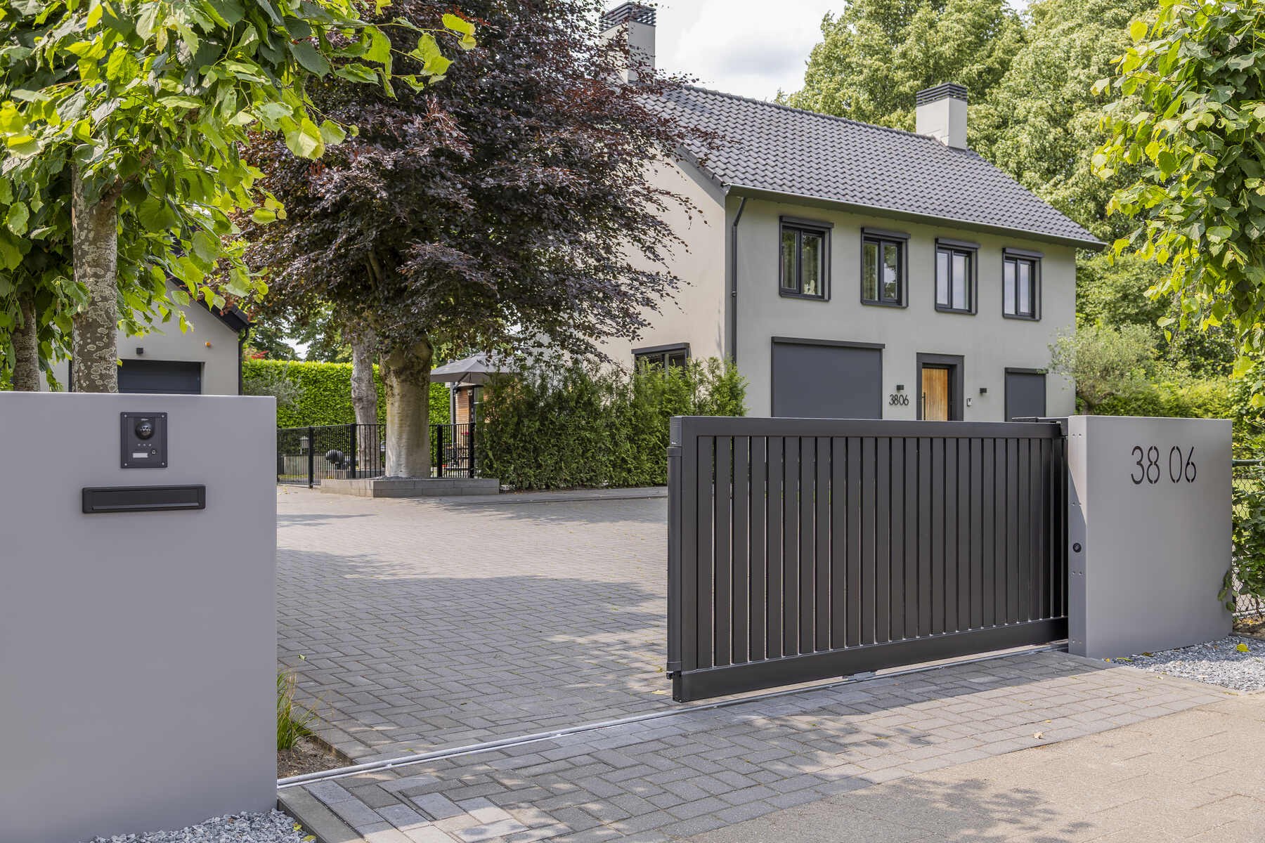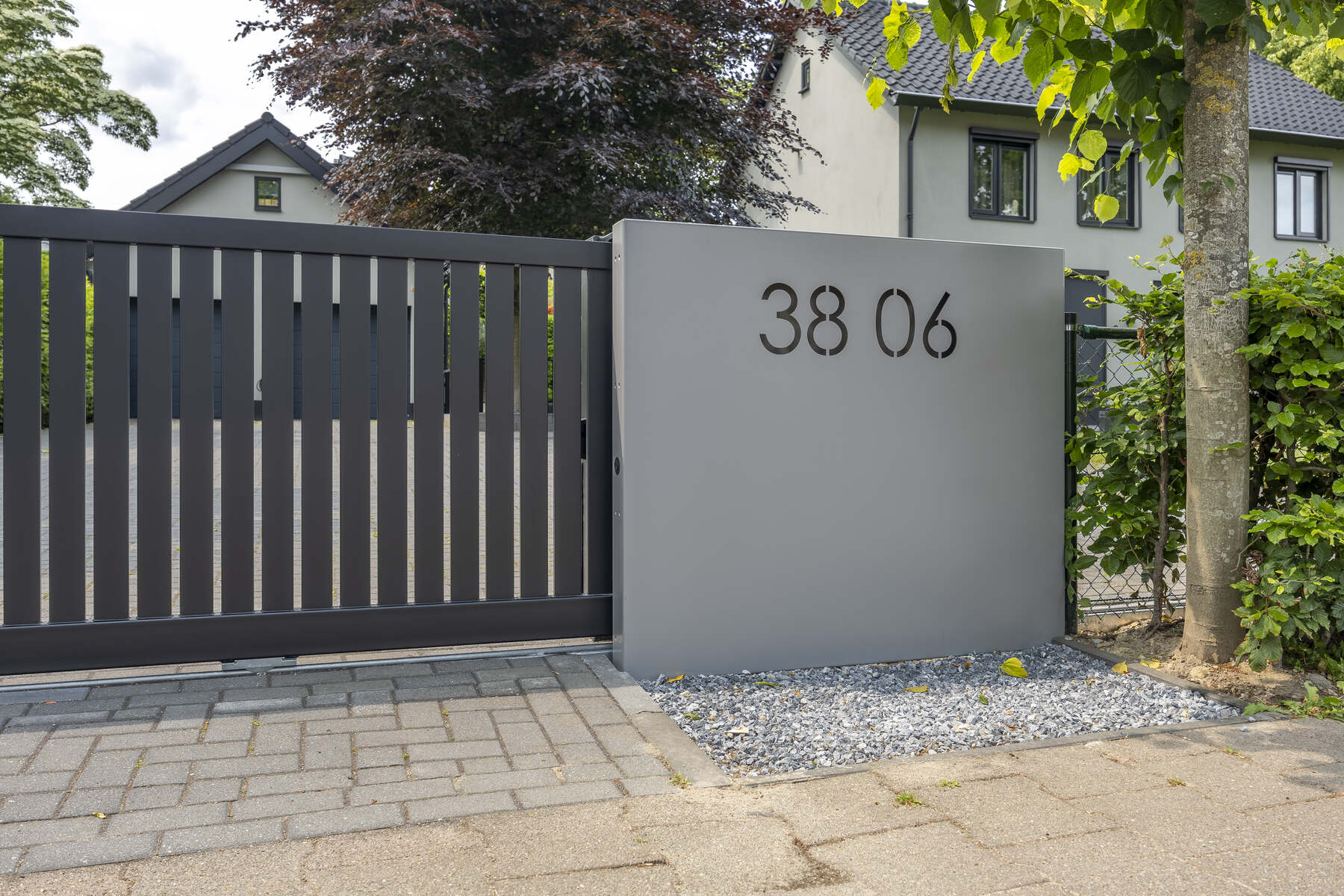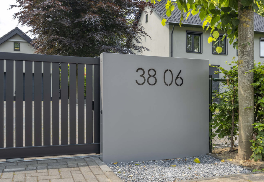 Een eyecatcher! Dat is deze elektrische schuifpoort, gecombineerd met gepersonaliseerde panelen. Deze maatwerk toegangspoort is voorzien van een geïntegreerde schuifpoortaandrijving, een brievenbus, verlichting en een naadloos geïntegreerd intercomsysteem. In het rechterpaneel is het huisnummer uitgelaserd. De toegepaste schemerschakelaar zorgt ervoor dat de het huisnummer subtiel wordt uitgelicht als de avond valt.