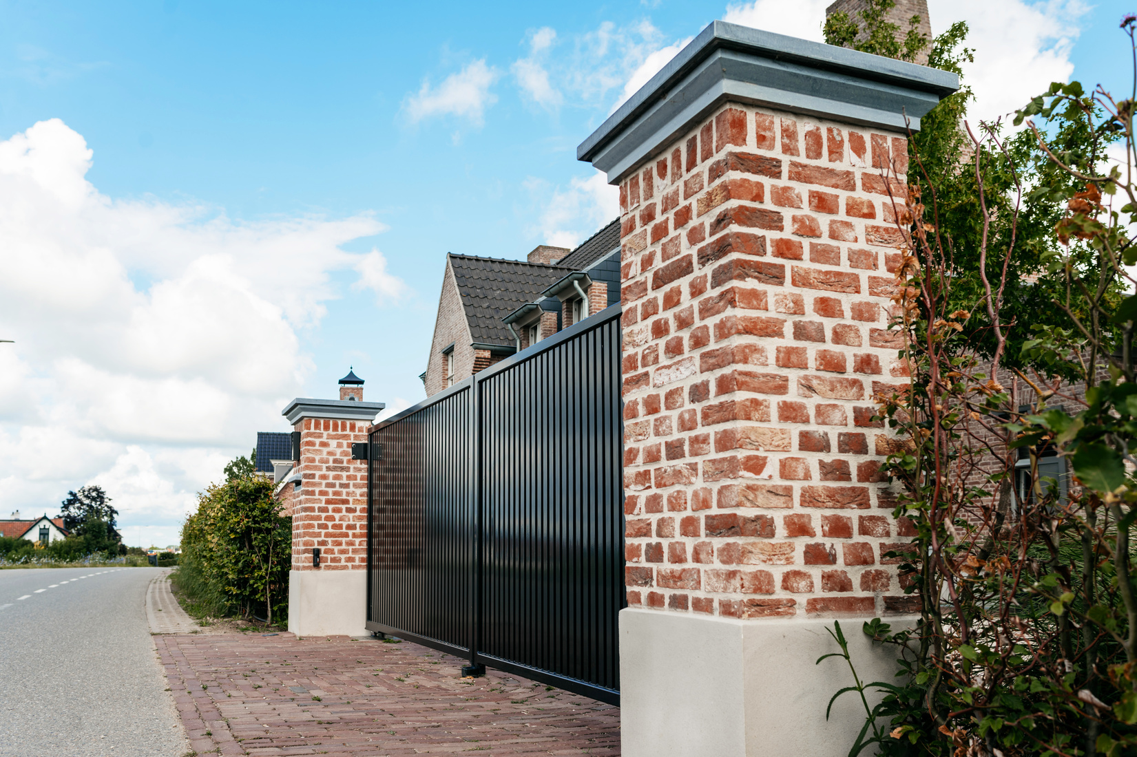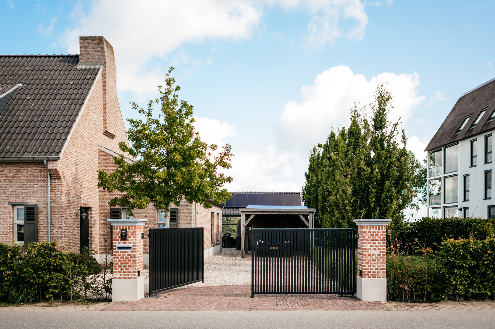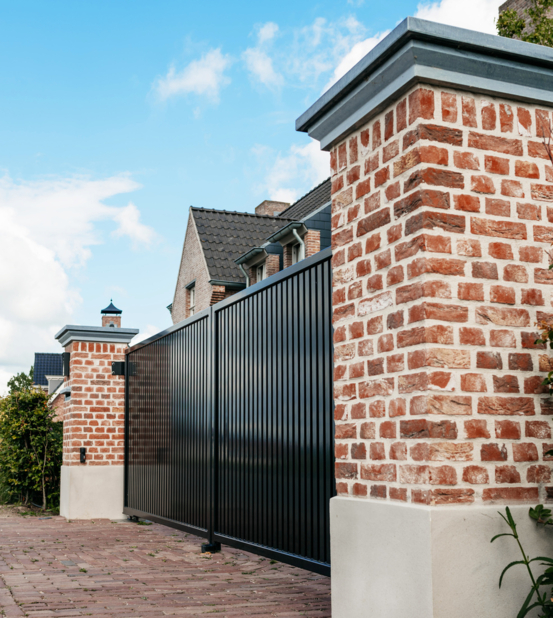 Voor deze prachtige Kempische woning in Opheusden hebben wij 2 elektrische dubbele draaipoorten geplaatst. Er is gekozen voor model Wageningen tussen gemetselde poeren in de stijl van de woning. Dit model is een fraai voorbeeld van een tijdloze sierpoort met een strakke en zeer stijlvolle uitstraling. De poorten zijn uitgevoerd met 180-graden scharnieren zodat de binnenste poortvleugels 180 graden open kunnen waardoor er ook eenvoudig voor de woning geparkeerd kan worden.