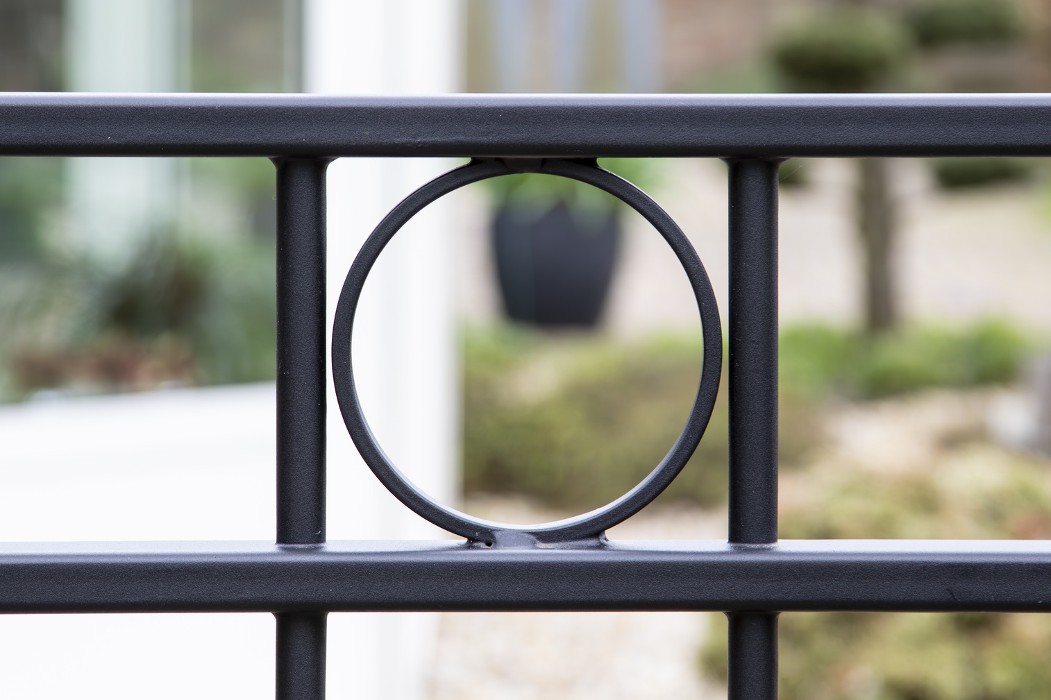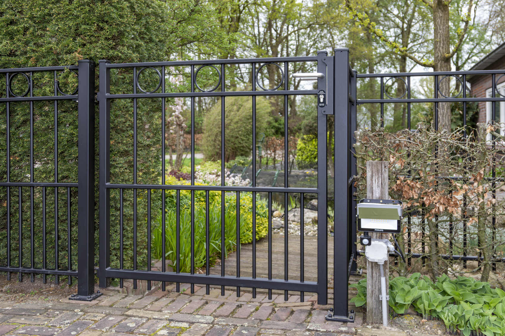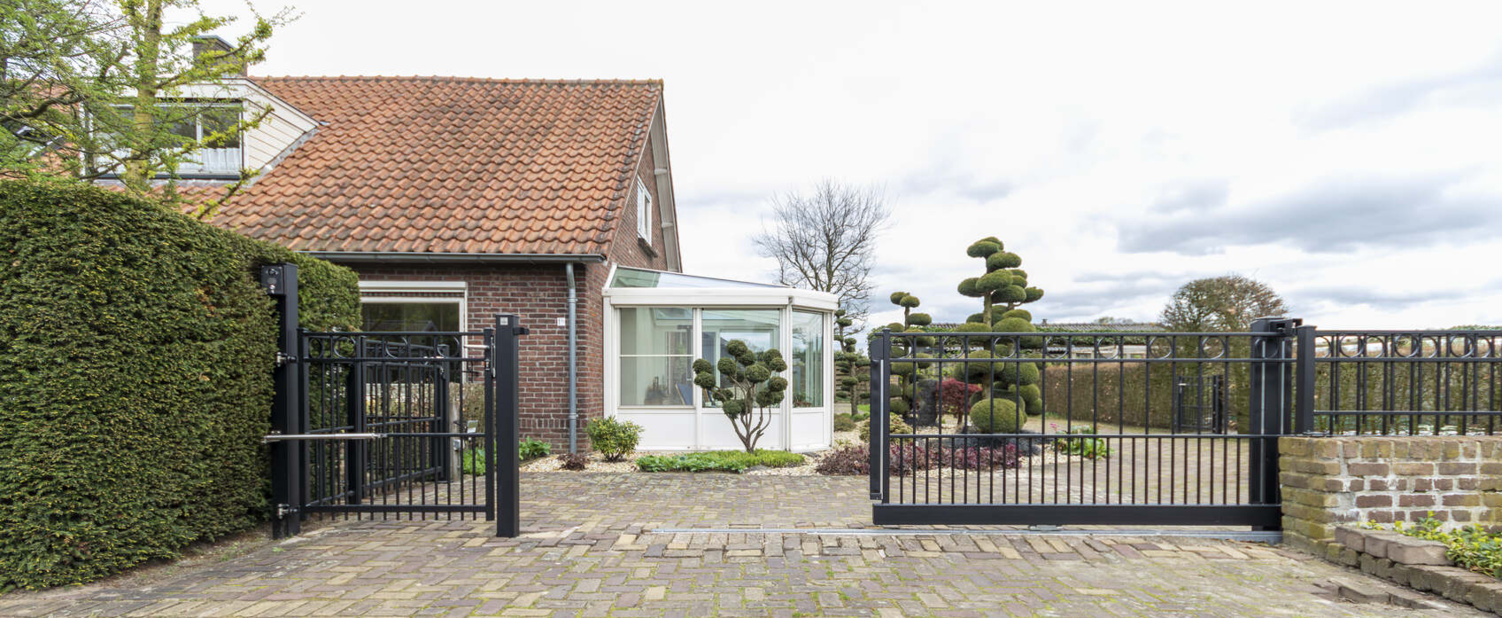 In Hoogland hebben we een klassieke elektrische railpoort geplaatst, in combinatie met 3 enkele sierpoorten en bijpassend sierhekwerk. Tussen de twee bovenliggers is om en om een ring gelast. Een sierpoort is voorzien van een hoogwaardige RVS deurdranger, zodat de poort automatisch sluit.
