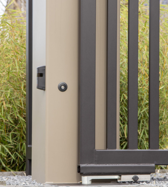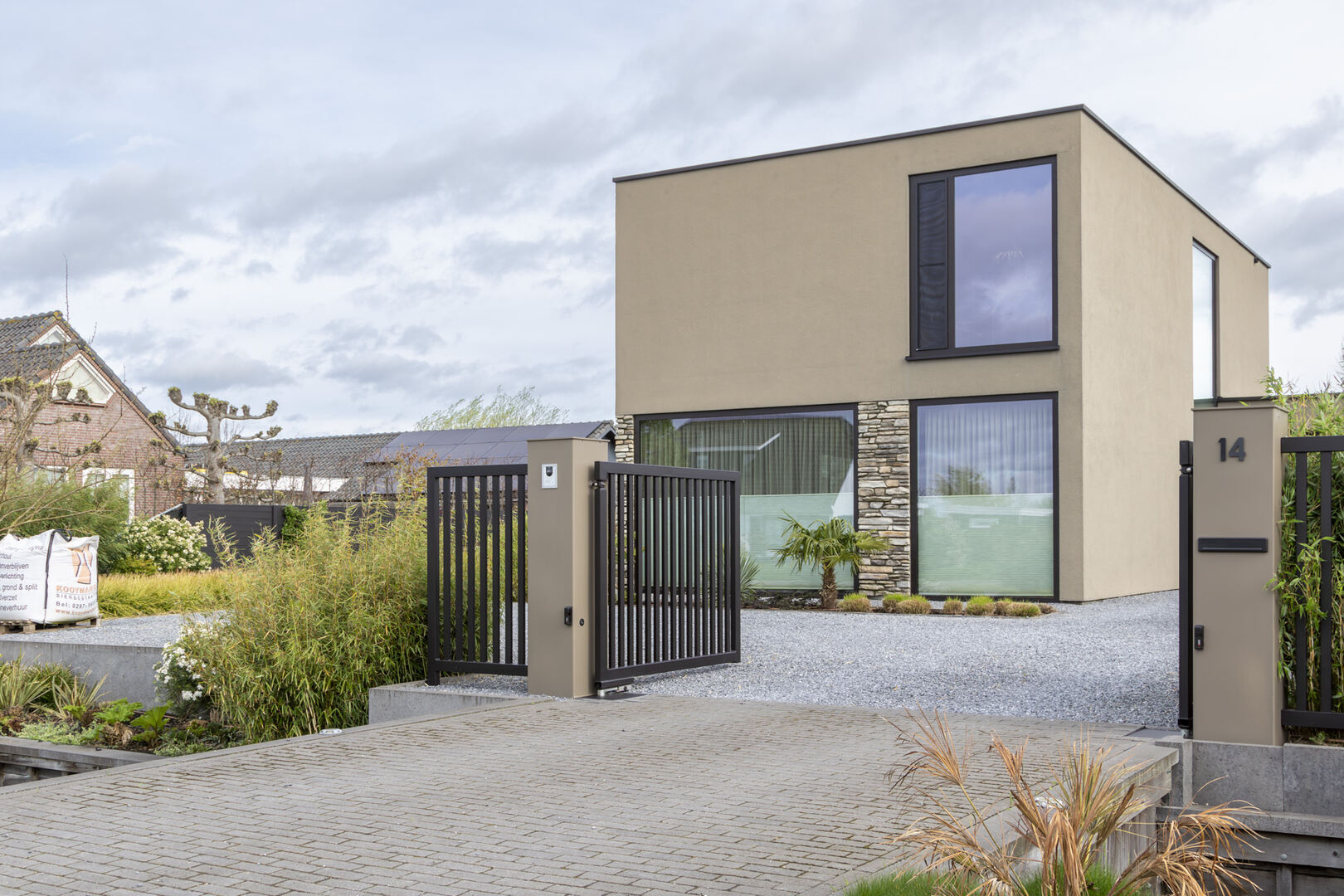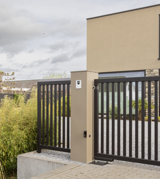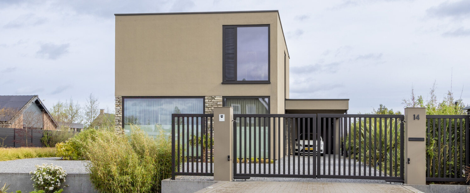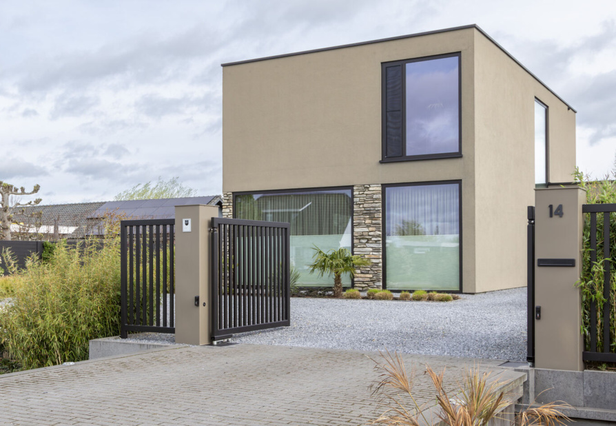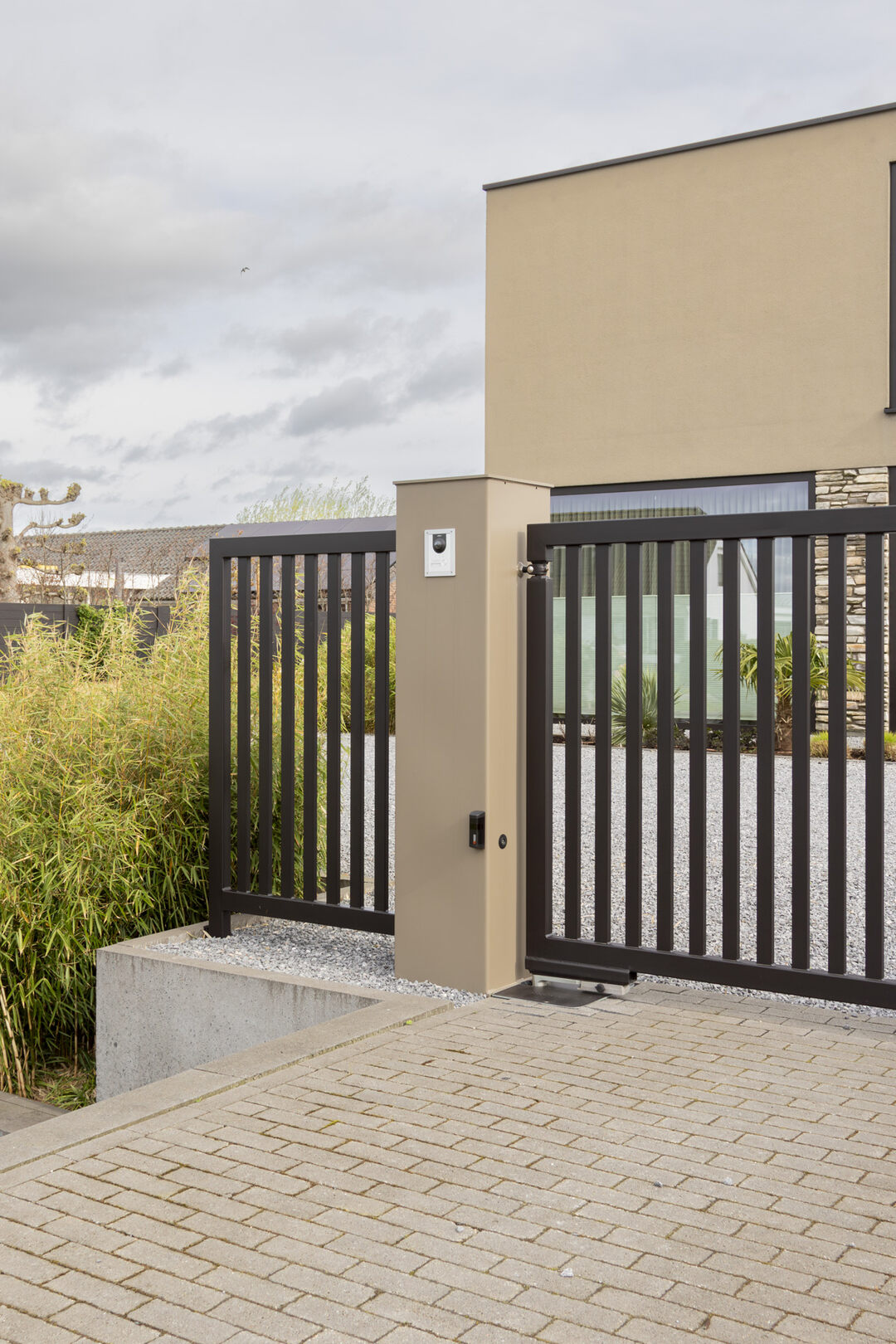 Deze moderne poort, model Dublin, is door ons geplaatst in De Kwakel. De poortvleugels zijn gemonteerd tussen stalen XL-palen van 400x400 mm, waarin een brievenbus, intercom, verlichting en huisnummer is verwerkt. Leuk detail: de XL-palen zijn gepoedercoat in een afwijkende kleur van de poortvleugels. Hierdoor matcht de poort perfect bij de woning.