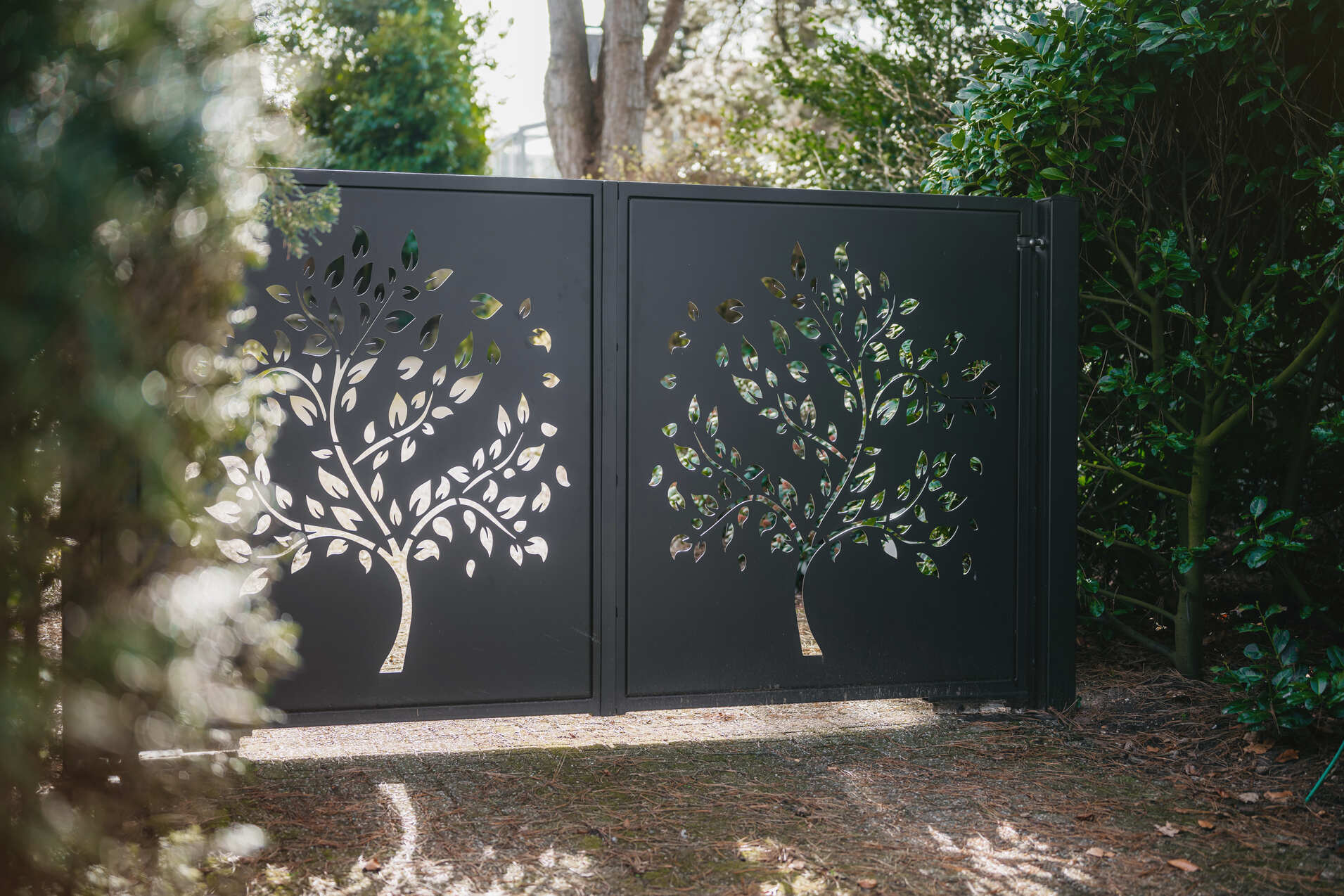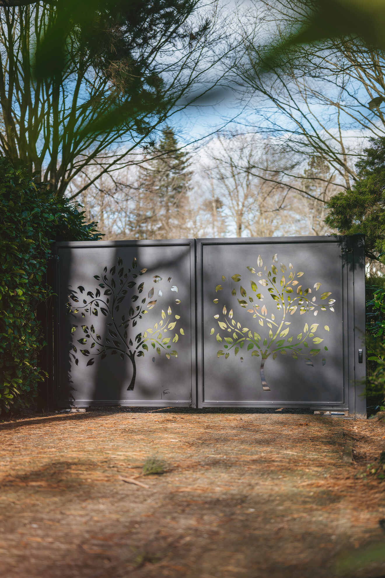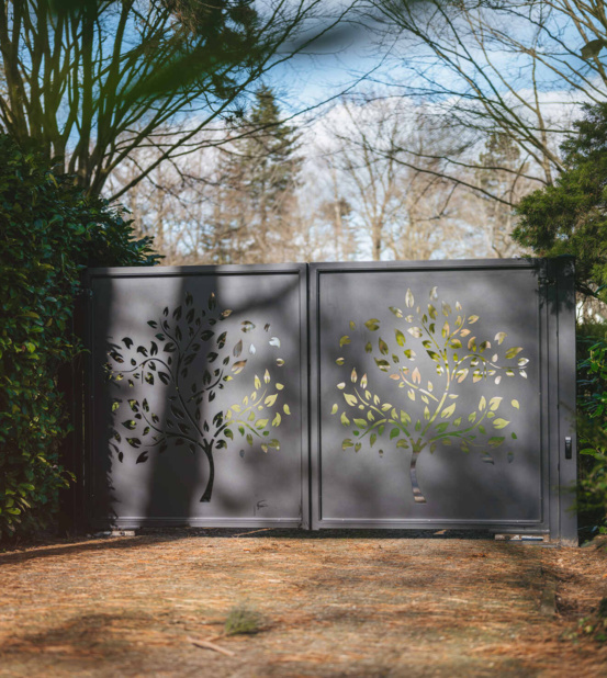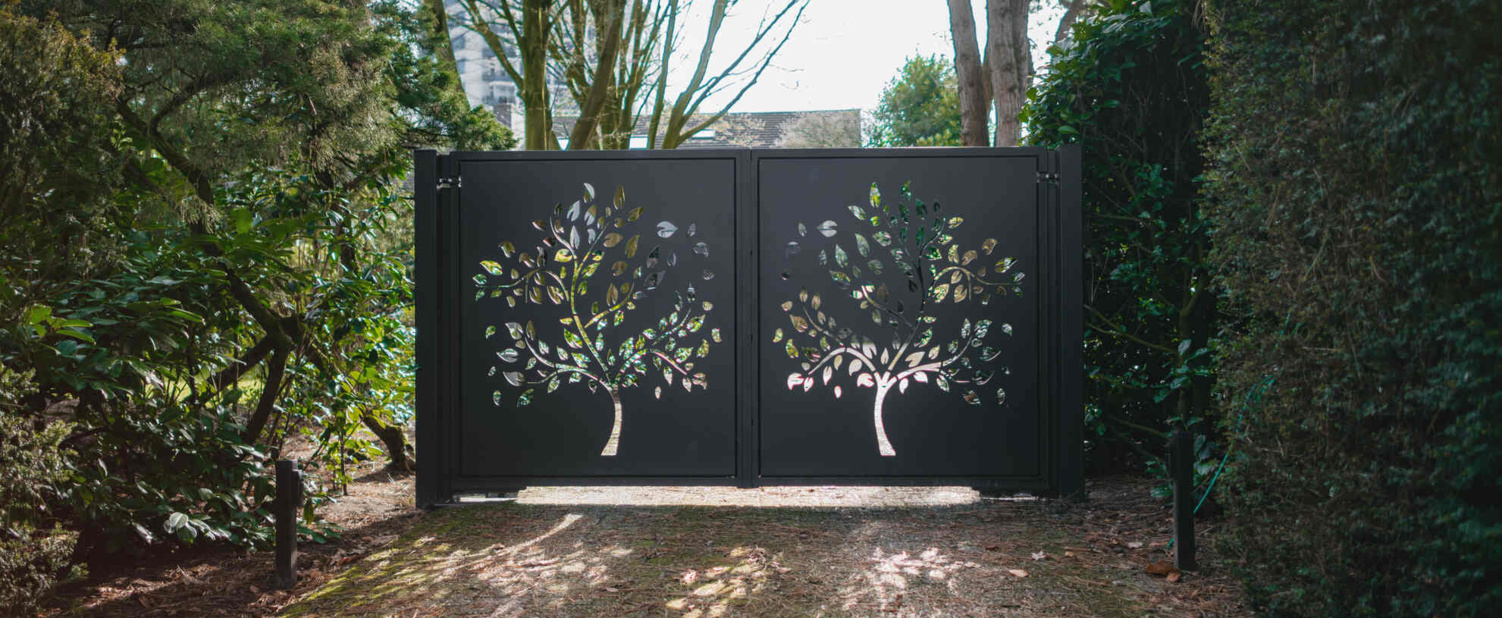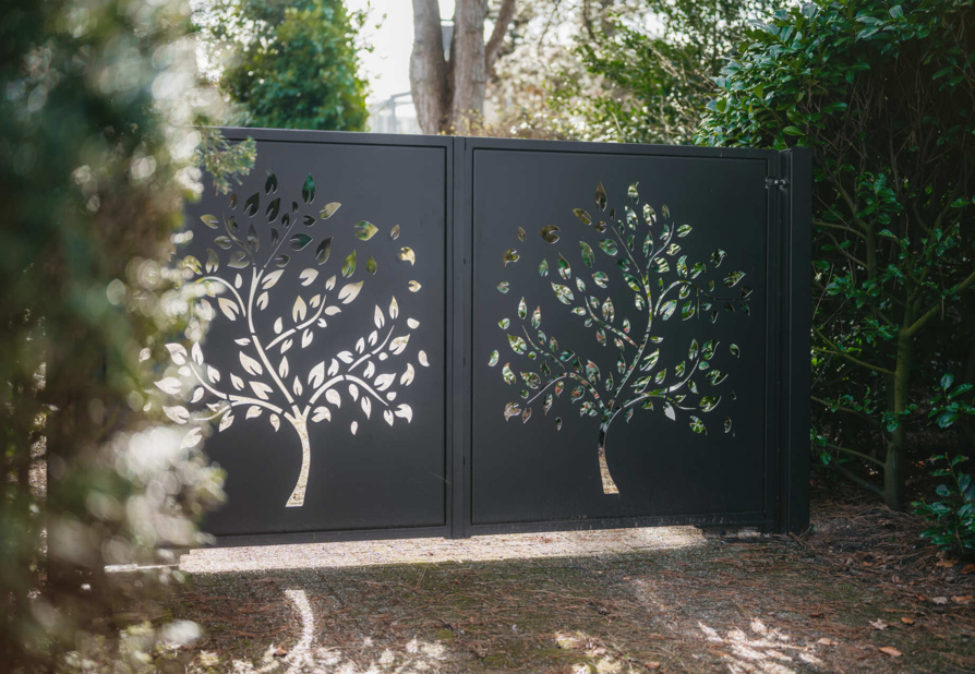 Deze elektrisch bedienbare dubbele inrijpoort hebben wij geplaatst in Rhenen. De poort heeft een unieke uitstraling door het boompatroon dat op de millimeter nauwkeurig is gelaserd uit een aluminium plaat. Daarnaast biedt de poort ook privacy doordat een groot gedeelte van de plaat gesloten is. Hierdoor is deze poort bijvoorbeeld ook perfect te combineren met een haag.