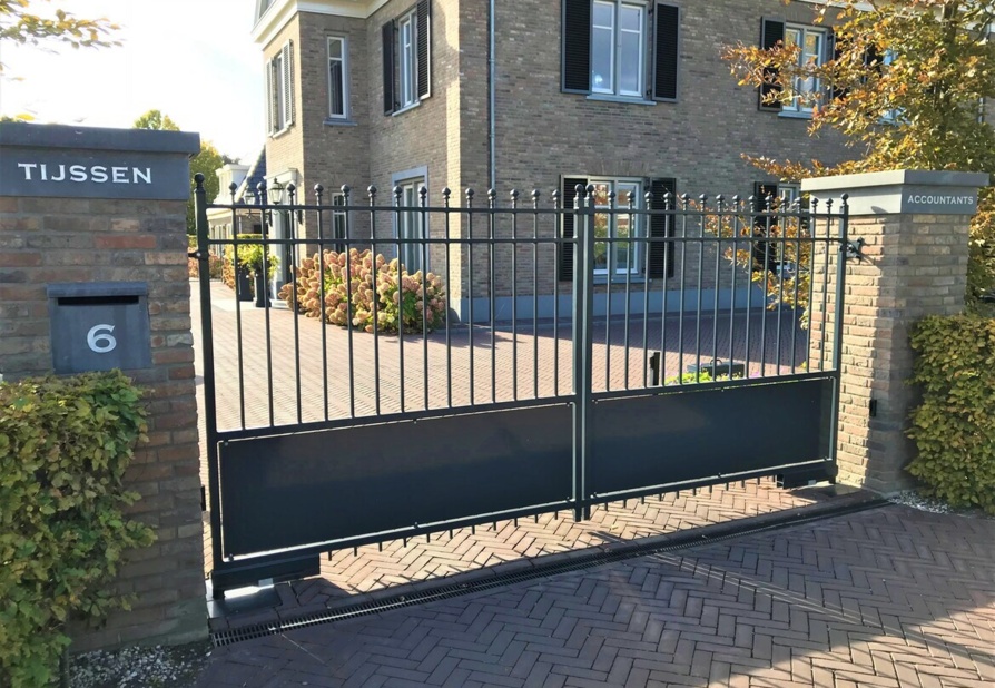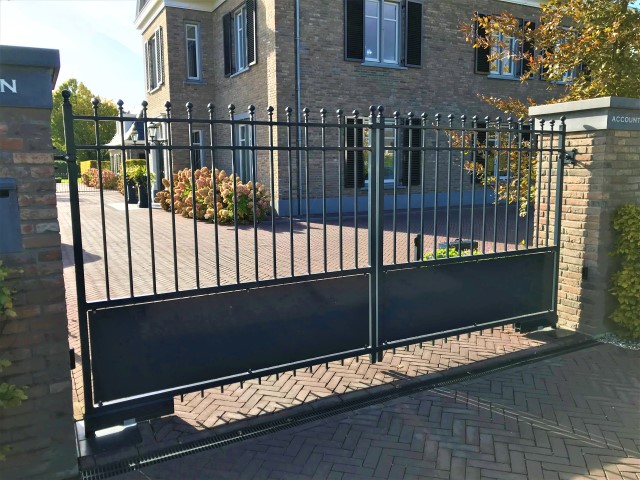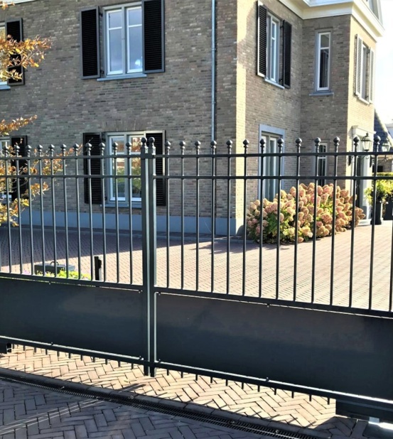 De toegangspoort model Berlijn is een poort die past in vrijwel iedere omgeving. De poort kenmerkt zich door zijn rechte lijnen en de plaat onderin de poort.