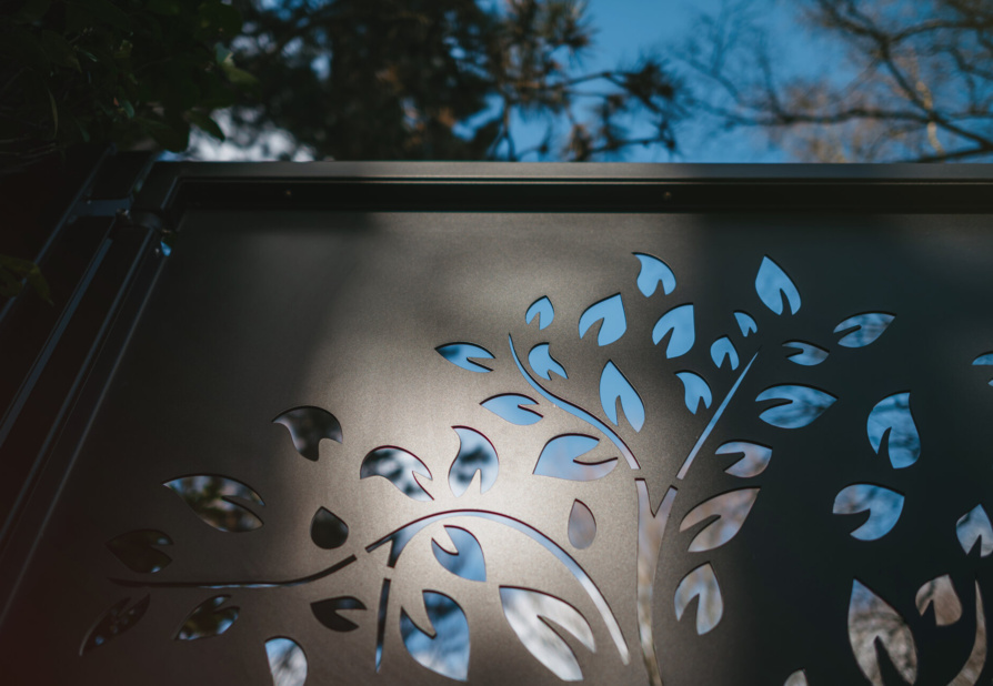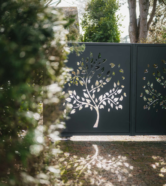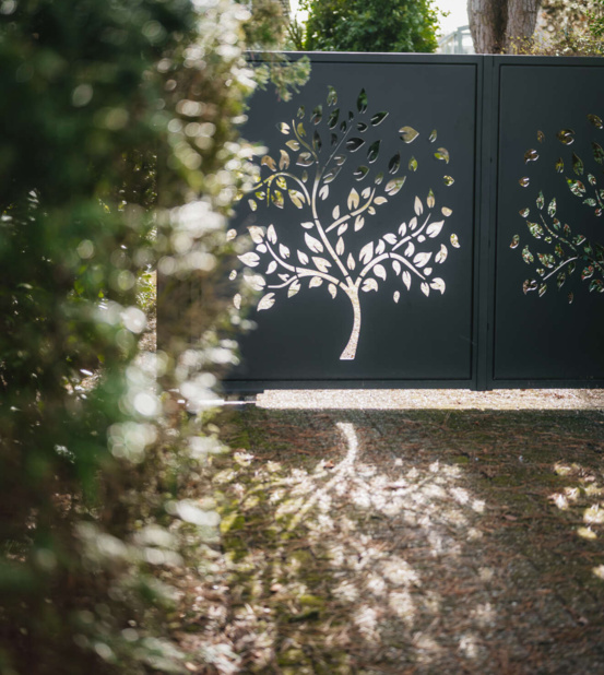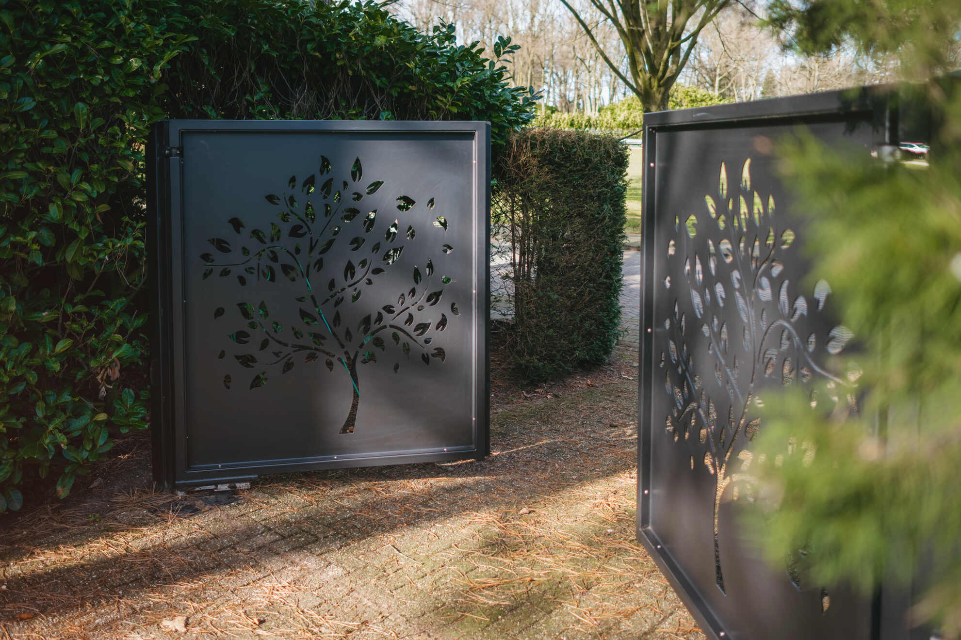 De sierhekwerk poort is voorzien van een frame van koker 50×50 mm. In het frame een aluminium plaat die op maat wordt gelaserd door een lasermachine. De plaat wordt voorzien van het boom patroon. De poort kan in alle breedtes worden toegepast.