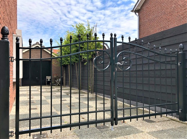 De inrijpoort model Praag onderscheidt zich door de unieke massieve sierkrul in het midden van de poort. Dit prachtige stukje maatwerk zorgt voor een geheel eigen uitstraling. Verder heeft de poort een neutrale uitstraling waardoor hij in zowel een klassieke als tijdloze tuin past.