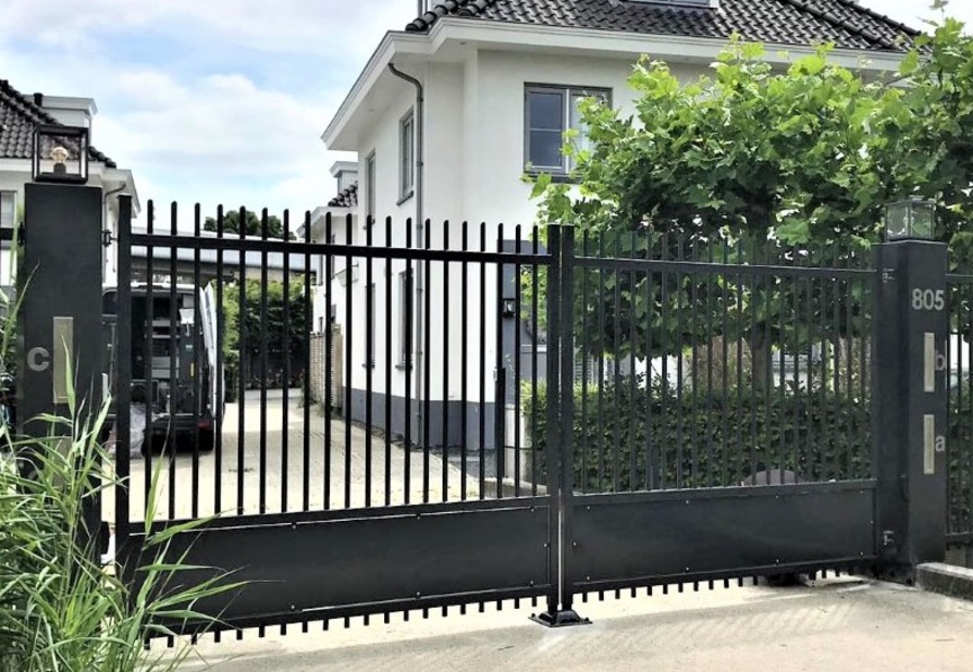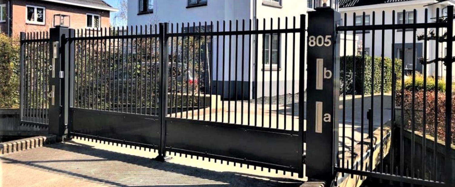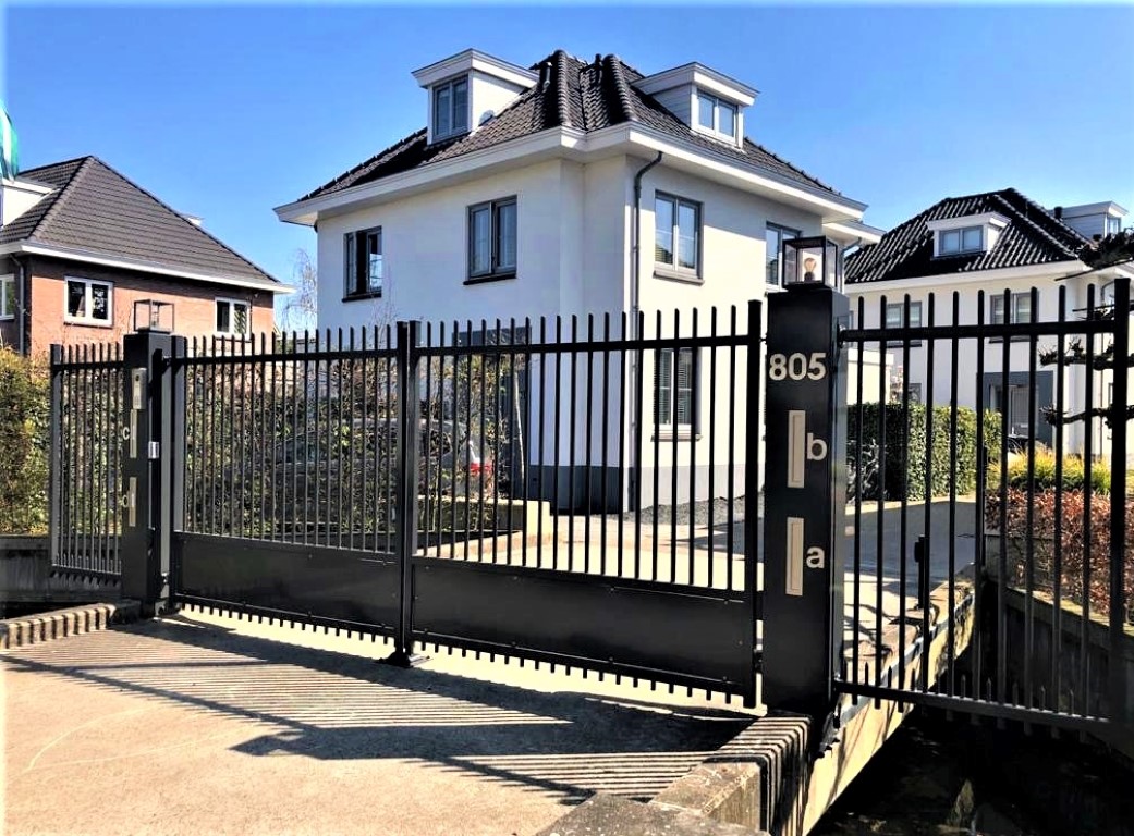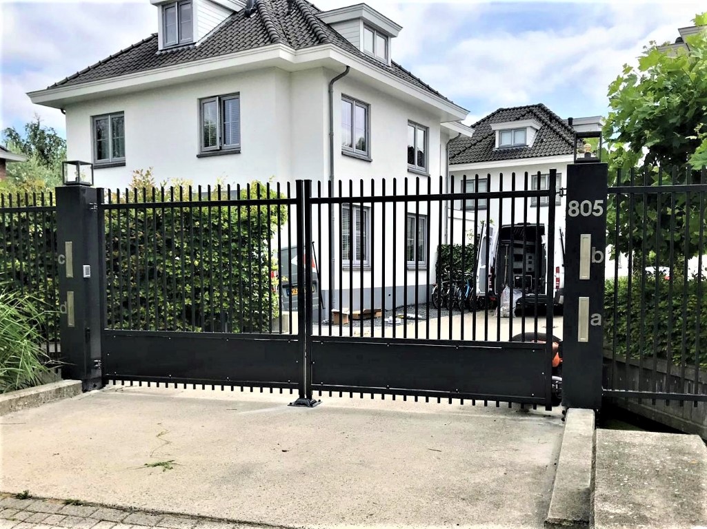 De toegangspoort model Riga heeft een geheel eigen uitstraling door de combinatie van een gladde schopplaat en verticale spijlen. De poort past in vrijwel iedere omgeving en kan mooi gecombineerd worden met een haag of hekwerk model Orion.