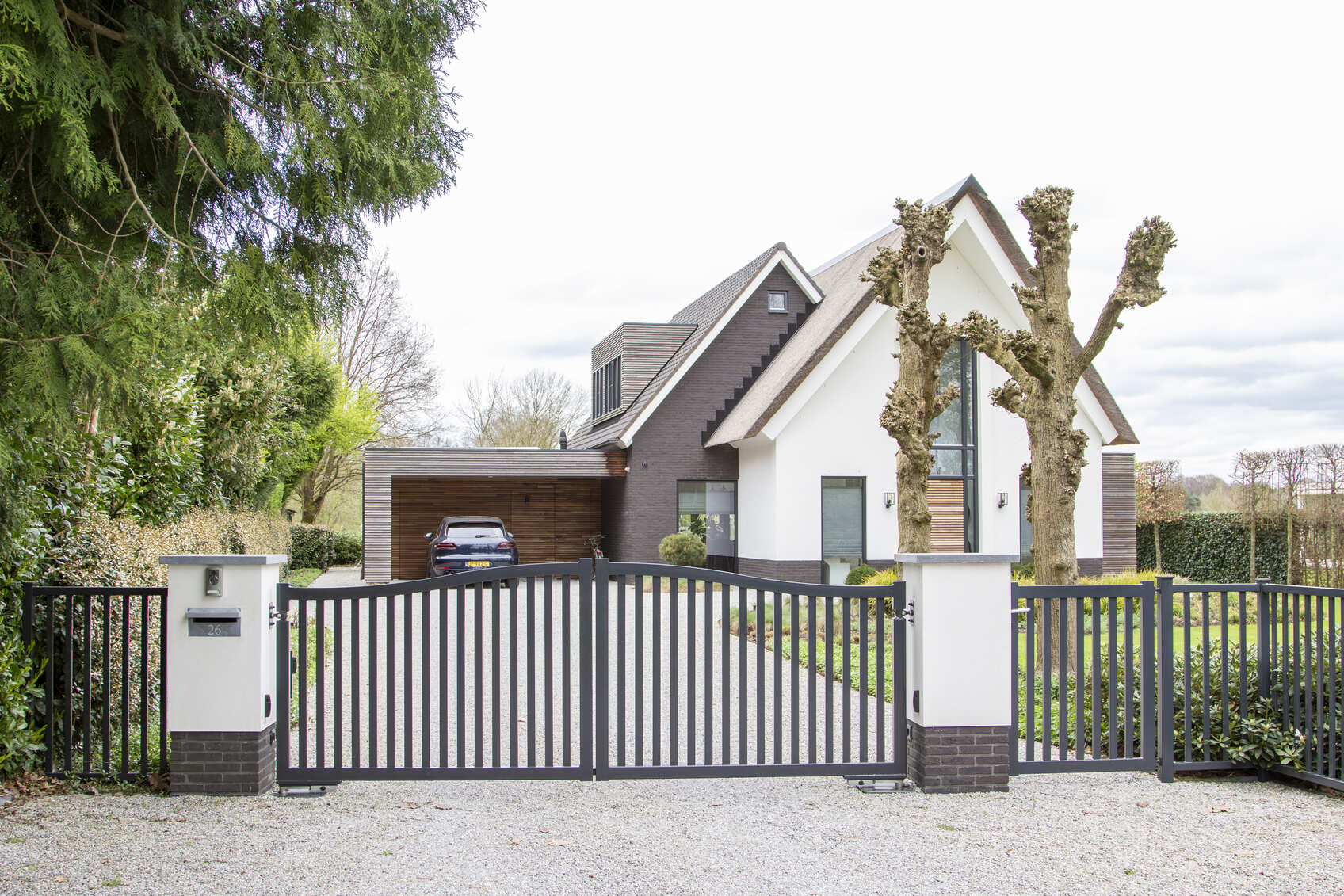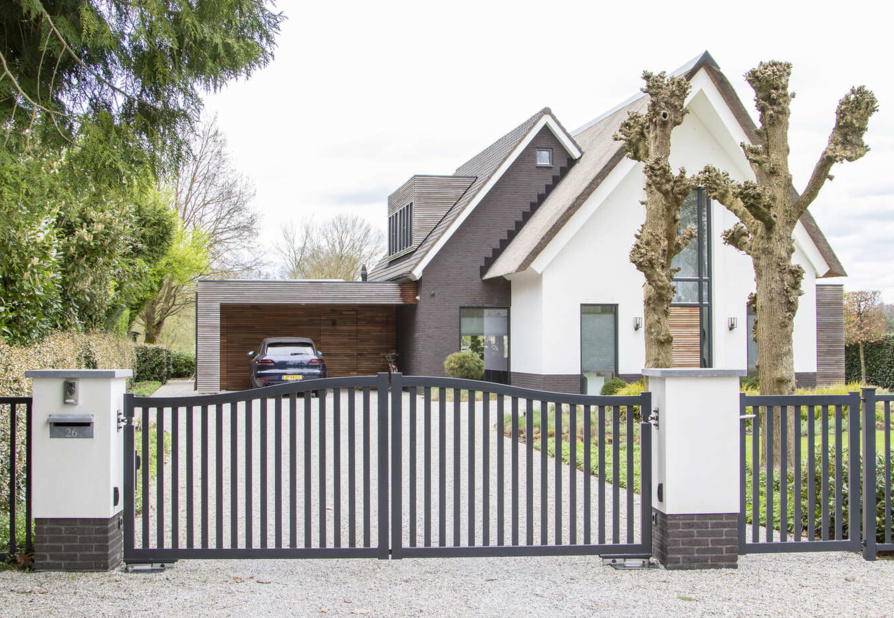 De poort wordt gemonteerd tussen robuuste, dikwandige palen. De palen worden ter plaatse in een betonfundatie gestort. Het is ook mogelijk om de poort tussen poeren te monteren. Dit is een ideal hekwerk voor een grote poort oprit.